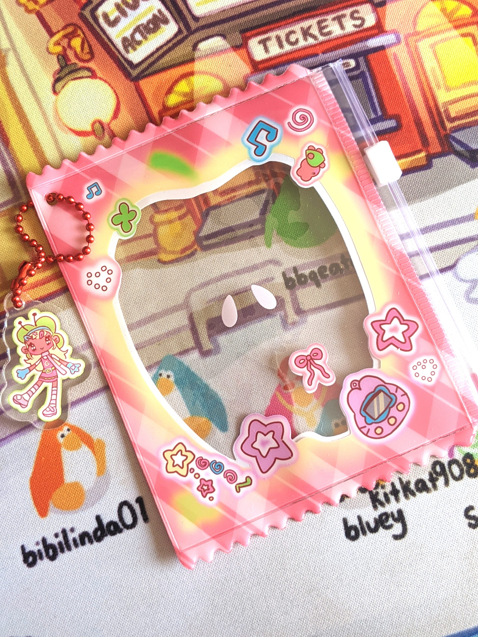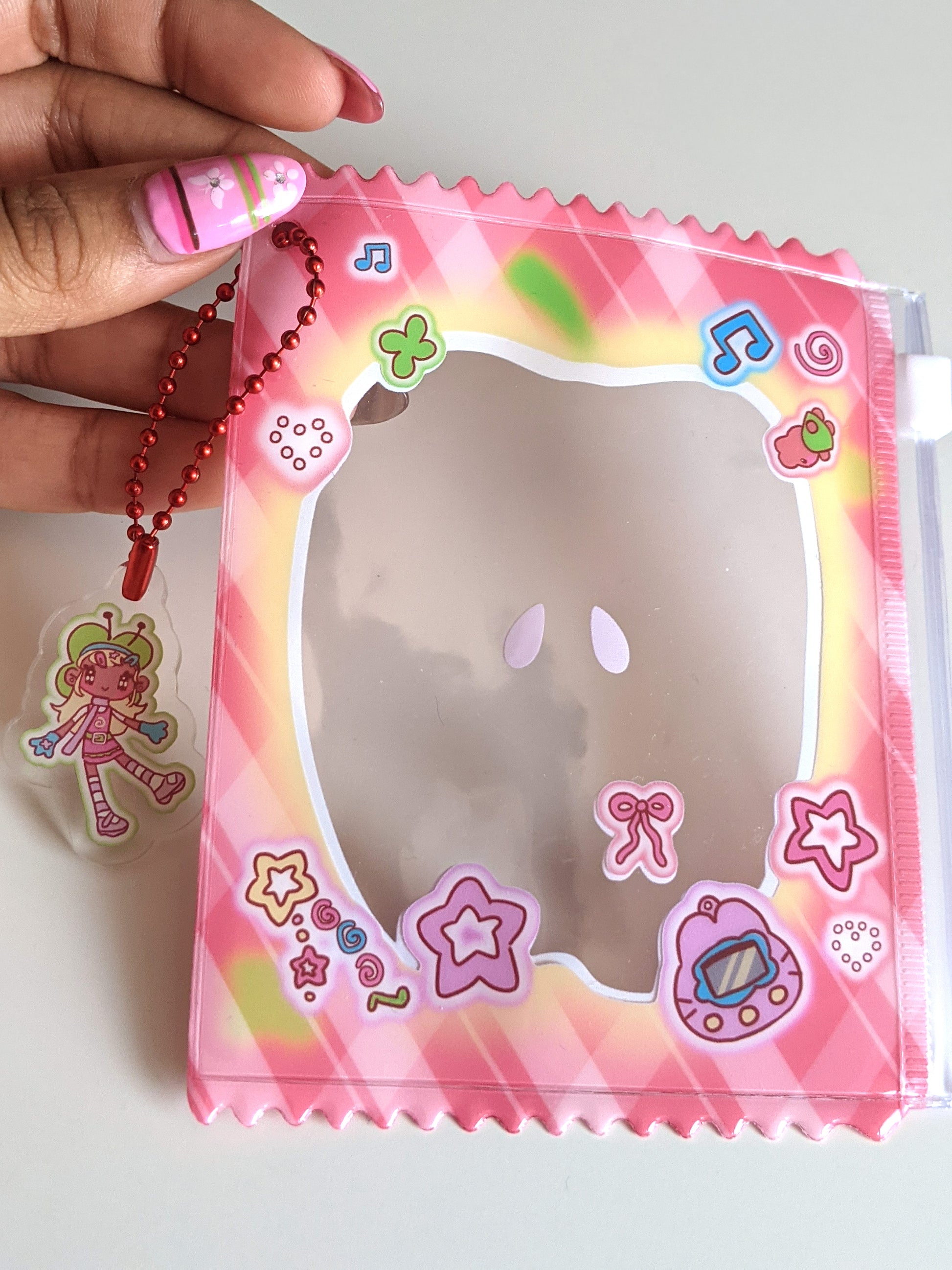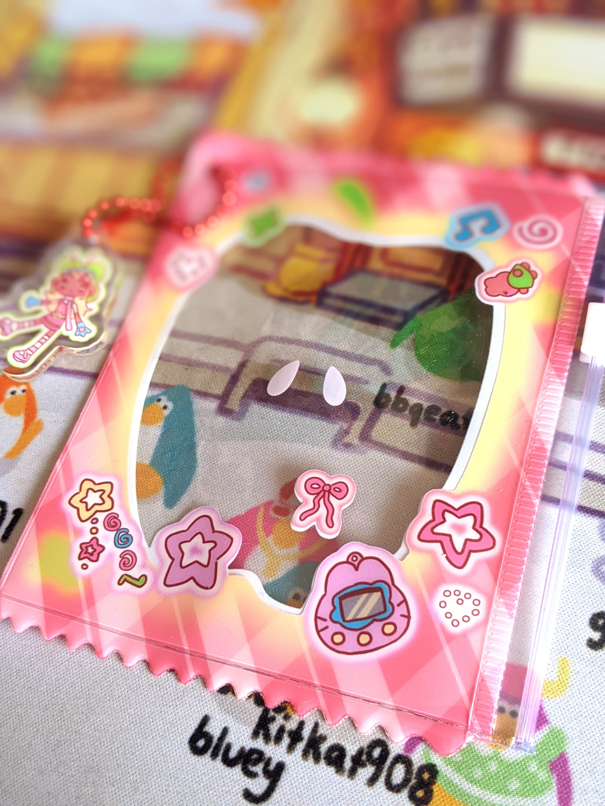 this cute little water-proof pouch is perfect for a photocard, your favourite charm or maybe just a little guy! the design is printed inside the bag to protect it from external damage, and it comes with a cute charm attachment!
